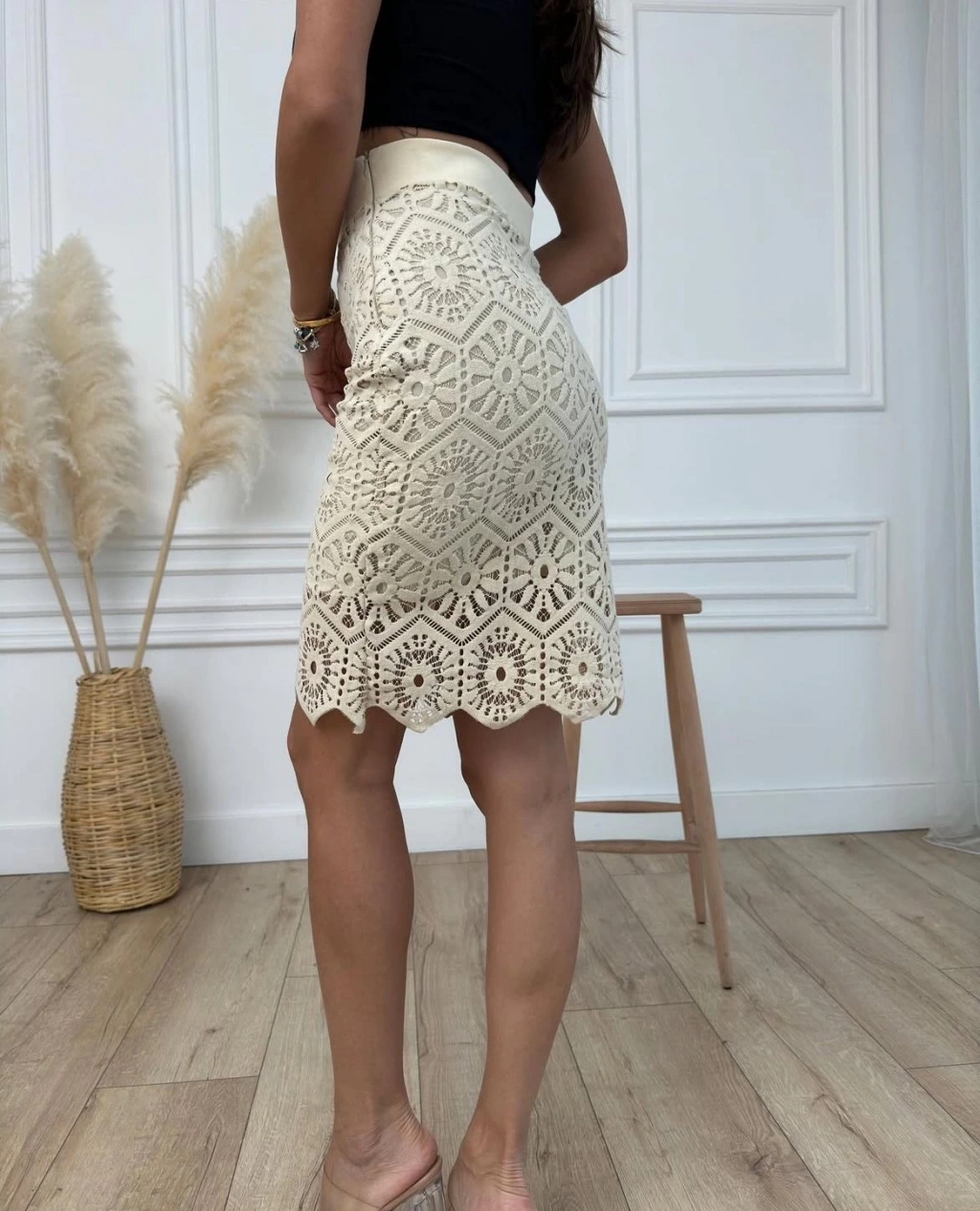 bej renkli zarif dantel kumaştan üretilmiş özel desenli şık etek. vücut hatlarını ön plana çıkaran dar kesimi ve feminen zarafetiyle klasik kombinler ve özel davetler için mükemmel bir seçim