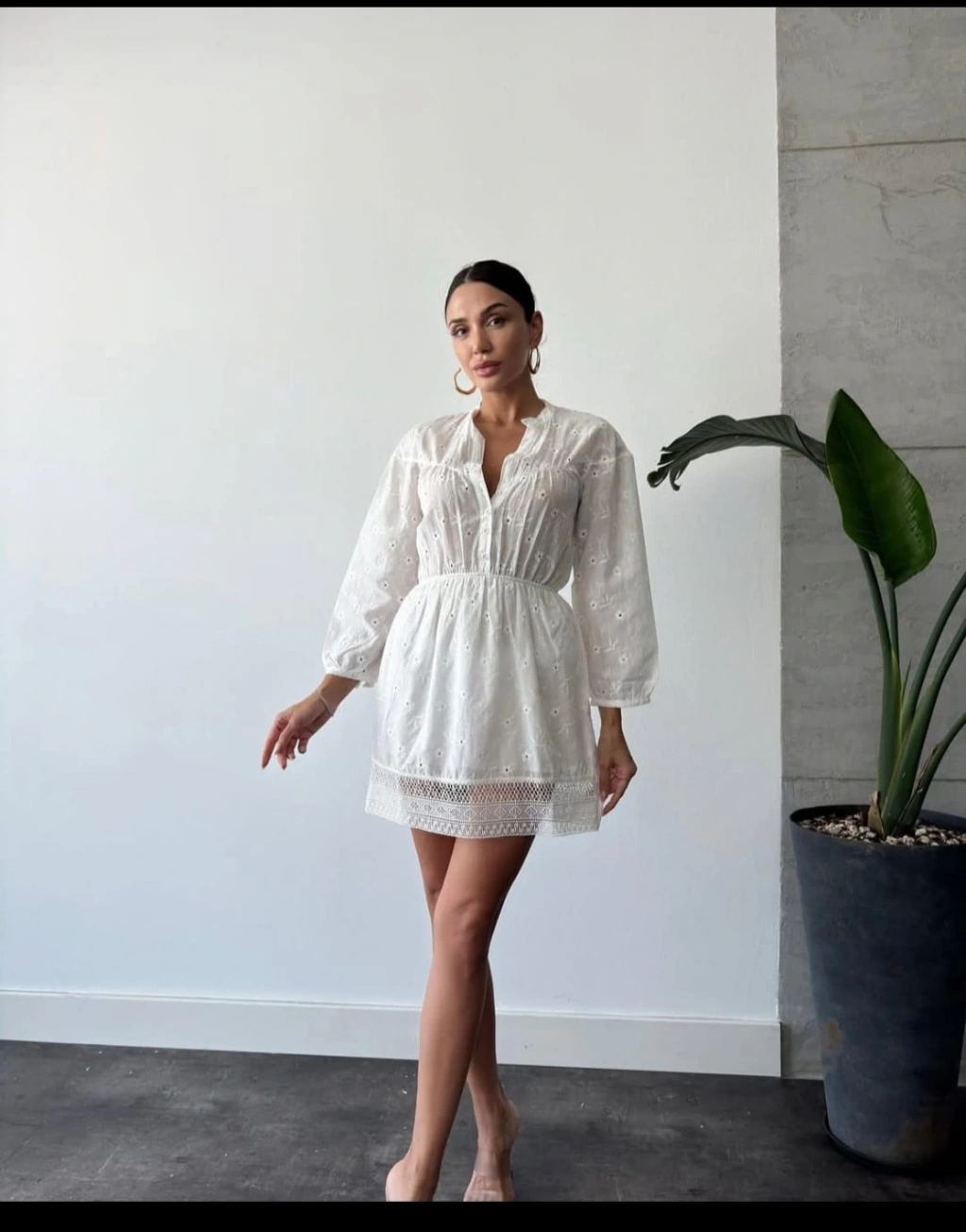 Beyaz R. Gipeli Uzunkol Dantel Gecişli Mini Bayan Elbise