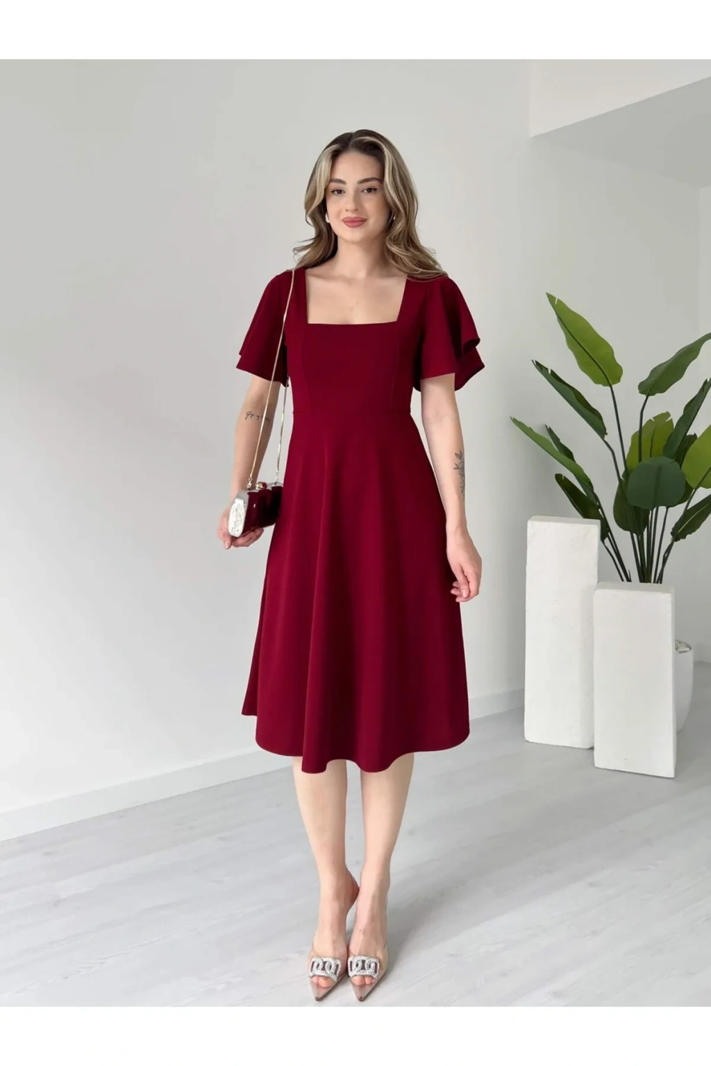 Bordo R. Dantel Kumaş Unun Kol Bayan Elbise