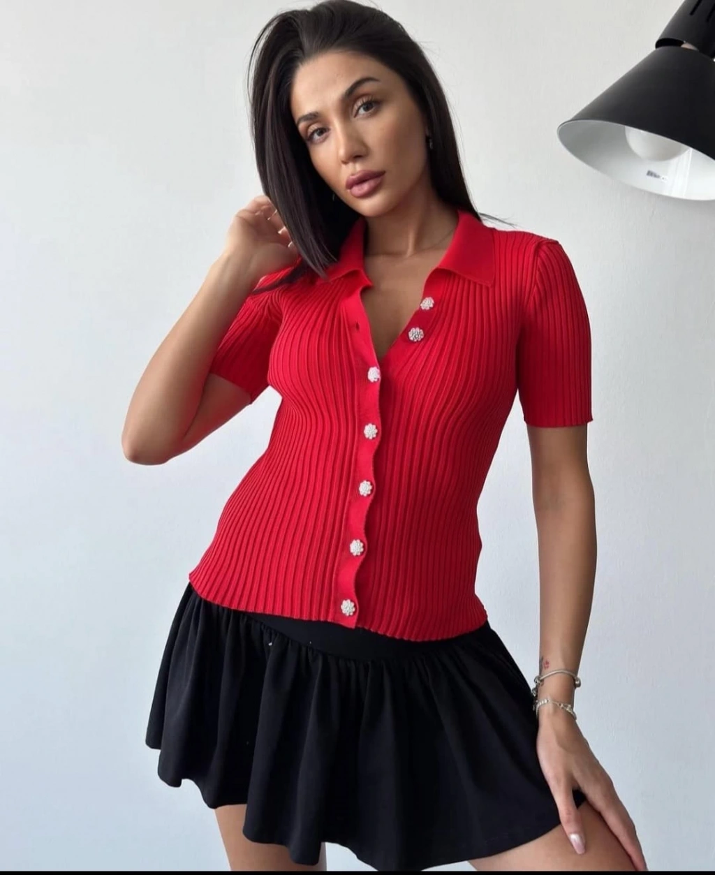 Kırmızı R. Fitilli Yarım Kol Düğme Taş Detaylı Bayan Bluz
