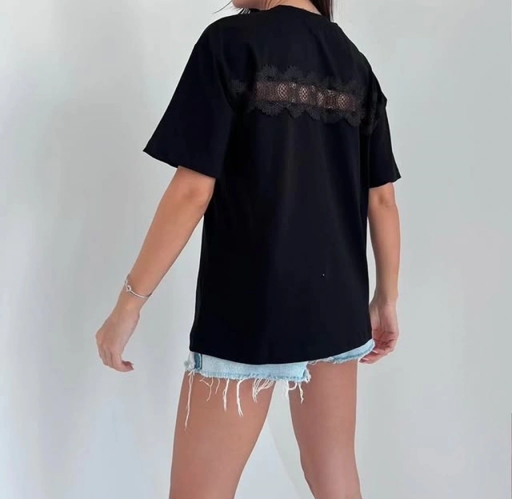 Siyah R. Önü Desenli Arka Dantel Geçişli Bayan Tşhirt