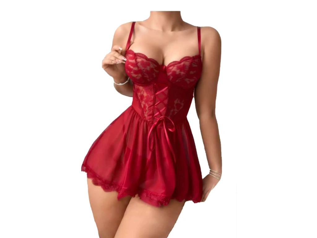Kirmizi R.Dantel Büstiyerli Transparan Seksi Fantazi Gecelik Takımı