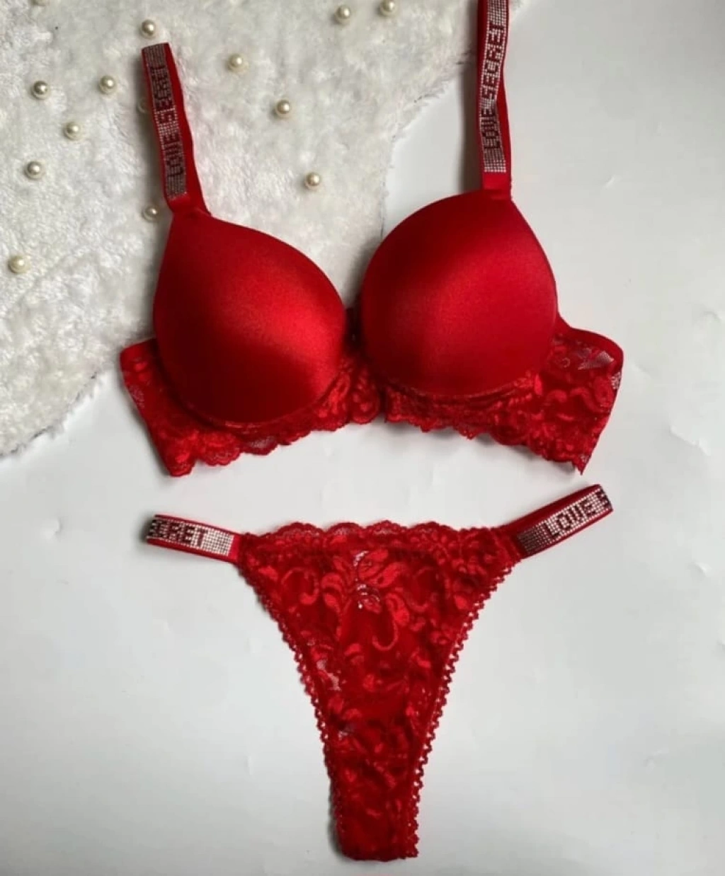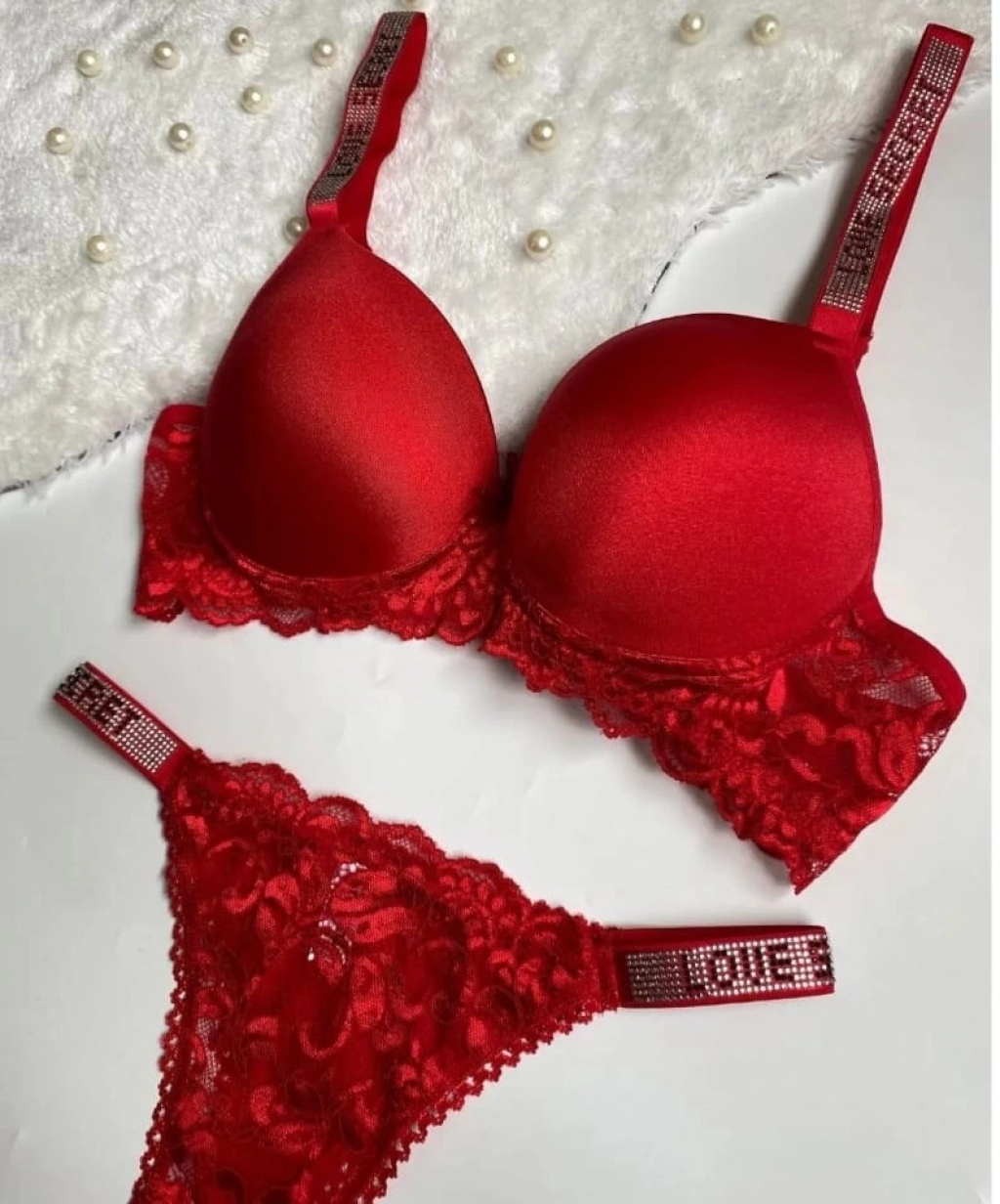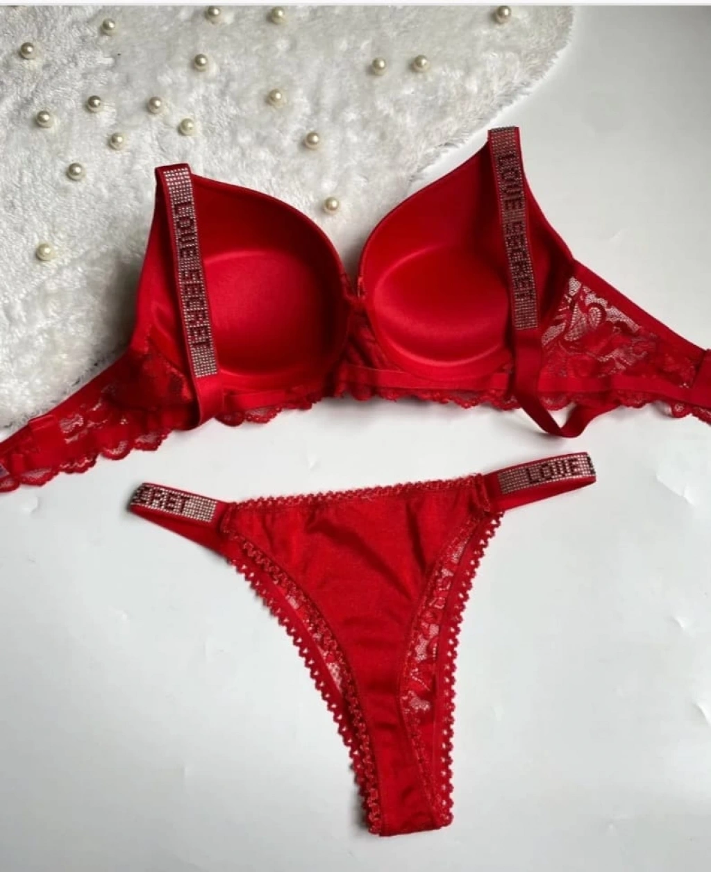 Kırmızı R. Dantelli Destekli Kenarı Taş İşlemeli İkili Sütyen Takımı