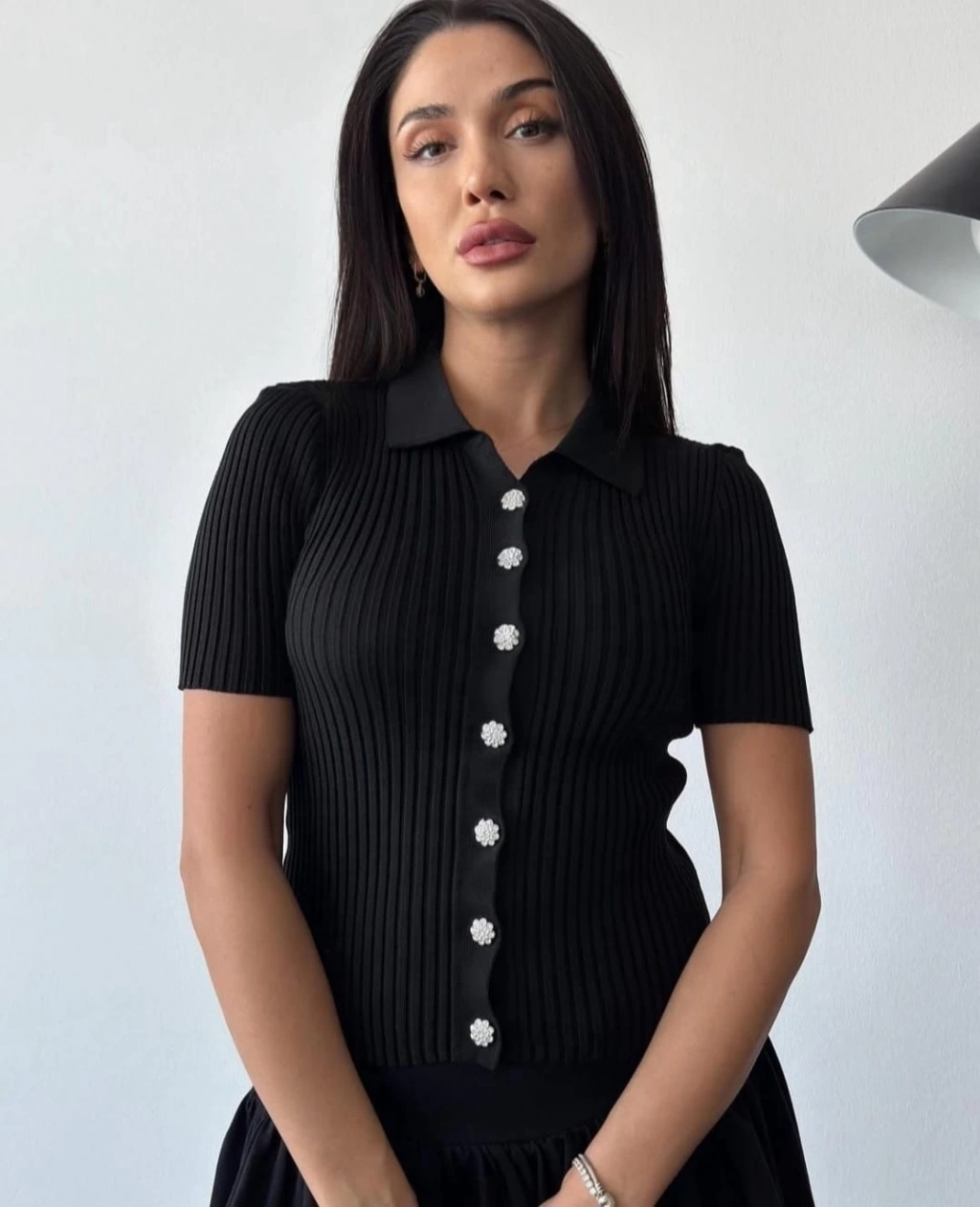 Siyah R. Fitilli Örme Yarım Kol Düğme Taş Detaylı Bayan Bluz