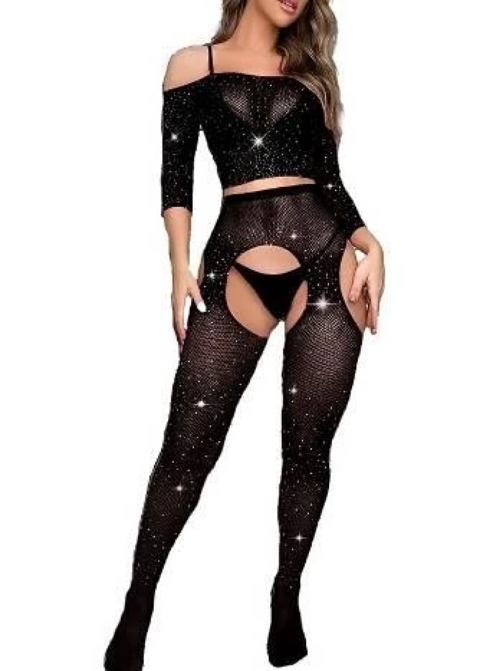 Siyah R. Taşlı Seksi Kadın Vucut Çorabı Elbise