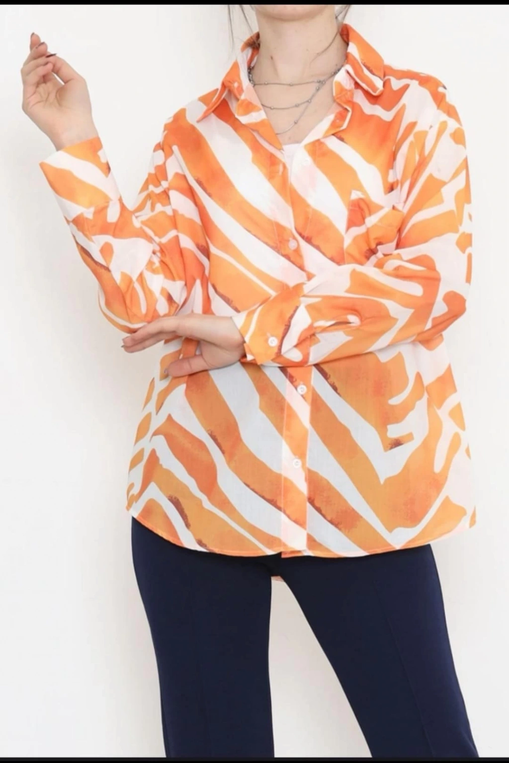 Turuncu Desen Saten Uzun Kol Rahat Kalıp Bayan Gömlek